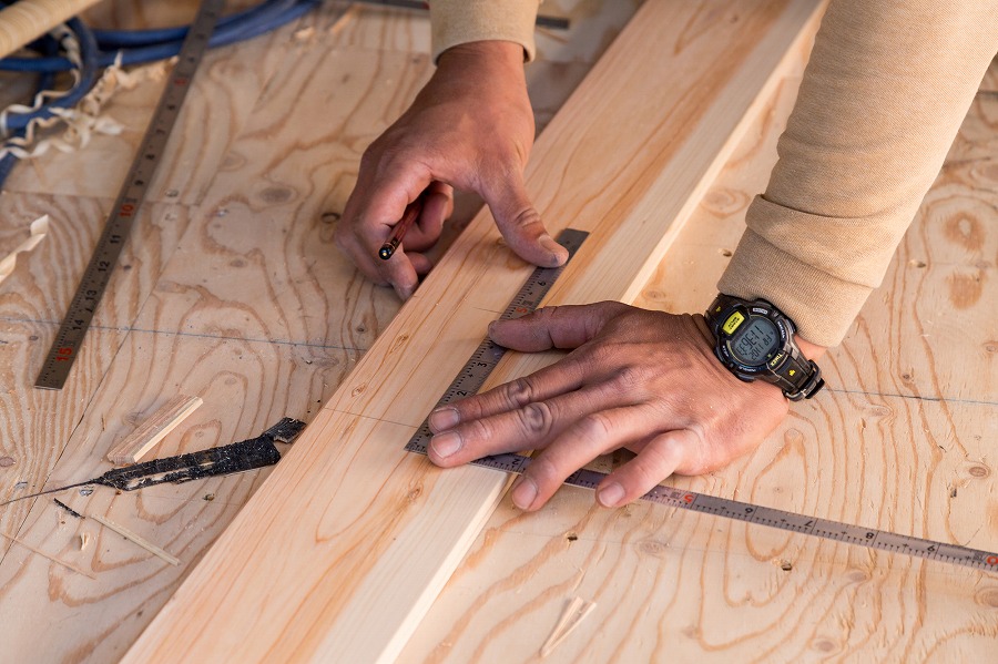 大工の仕事は、建築士の作成した設計図に従って建築材料を加工し、建物の柱や梁、天井、外壁、内壁、床などの下地を木材で構築することです。主な作業内容は、工場での「加工」と、現場での「組立」の2つです。加工では木材を切削・加工し、組立ではそれを現場で組み立てて建物の骨組を作ります。現場で作業を行う大工を募集しています。